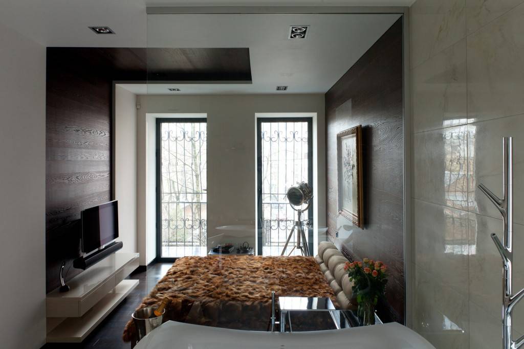 В помещении используется оригинальный декор. Предметы расставляют вдоль стен, располагают возле спального ложа.