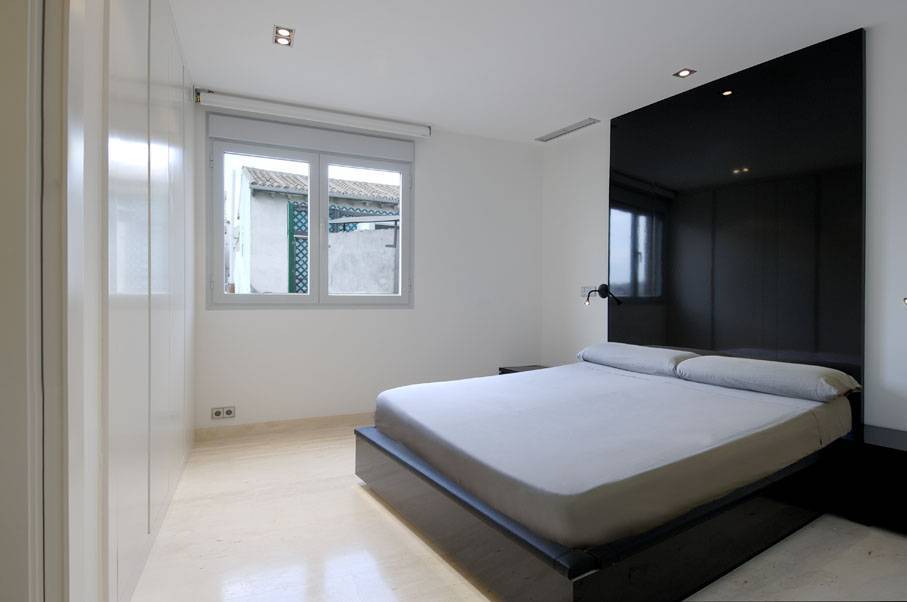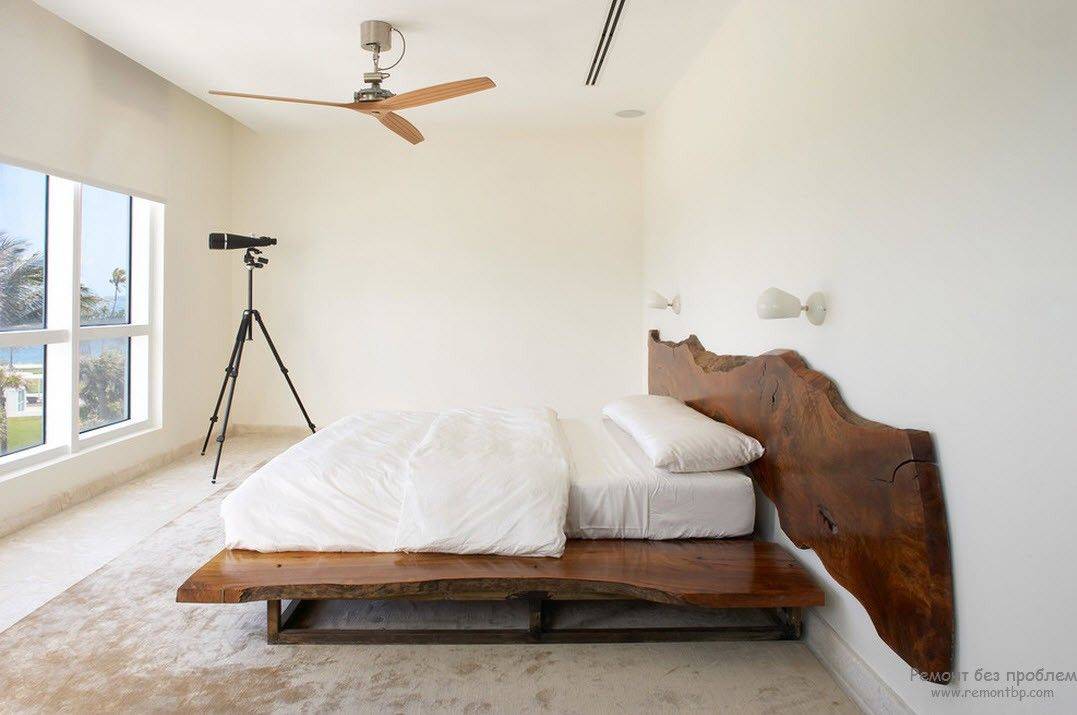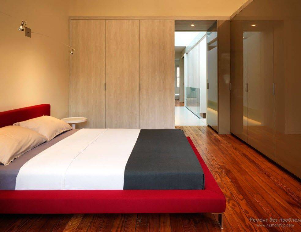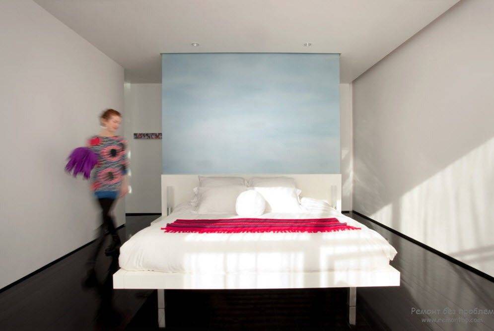 В минималистских спальнях центральное место отведено кровати. Чаще эта кровать-платформа или татами со скрытыми ножками. Изголовье кровати либо отсутствует вовсе, либо отличается минималистским дизайном. Возможно устройство кровати на стационарном подиуме с оборудованной в нем системой хранения.