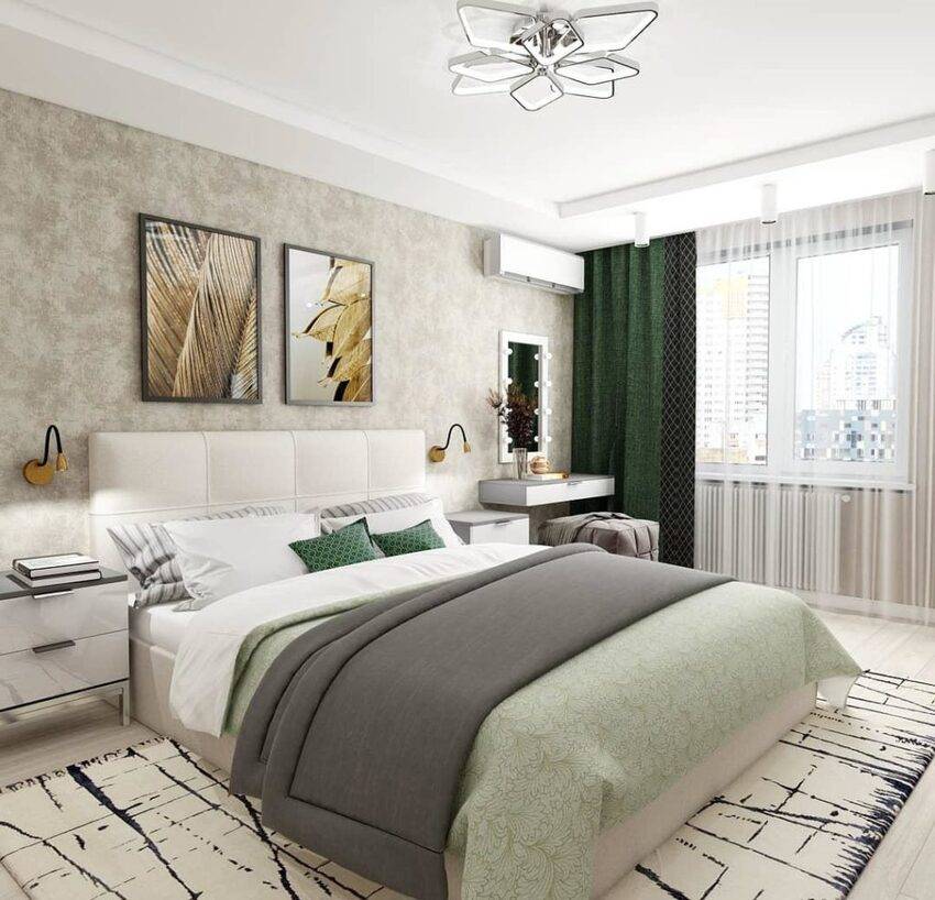 - размещать ковер на полу или нет — каждый решает сам, но его отсутствие также зрительно расширяет пространство спальни.