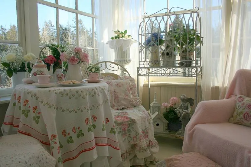 Мебель необходимо выбирать светлых тонов, используя различные льняные скатерти с рюшами и кружевами, накидки на стулья и цветочные орнаменты.