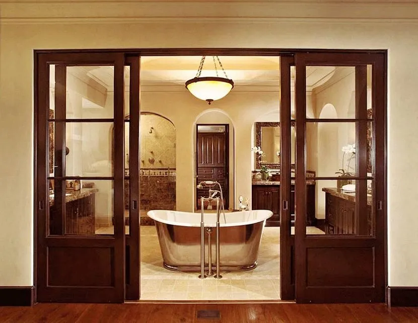Еще одним интересным вариантом раздвижной двери в ванную и туалет является дверь-купе. Хотя это не лучший вариант для санузла, его все же используют. Это целесообразно для большой ванной комнаты, где не стоит вопрос об экономии пространства. Все дело в том, что эти двери не бывают узкими, но их преимущество заключается в легкости – благодаря оборудованному стеклу появляется эффект отсутствия двери, и так вы можете зрительно расширить пространство.