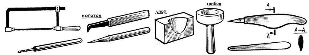Для обработки раковин используется специальный инструмент, большей частью самодельный, см. рис. Пилка слева вверху – не ножовка по металлу, а миниатюрный лобзик, т. наз. янтарный; рукоятку держат двумя пальцами. Его не обязательно искать в продаже, можно сделать самому из велосипедной спицы.