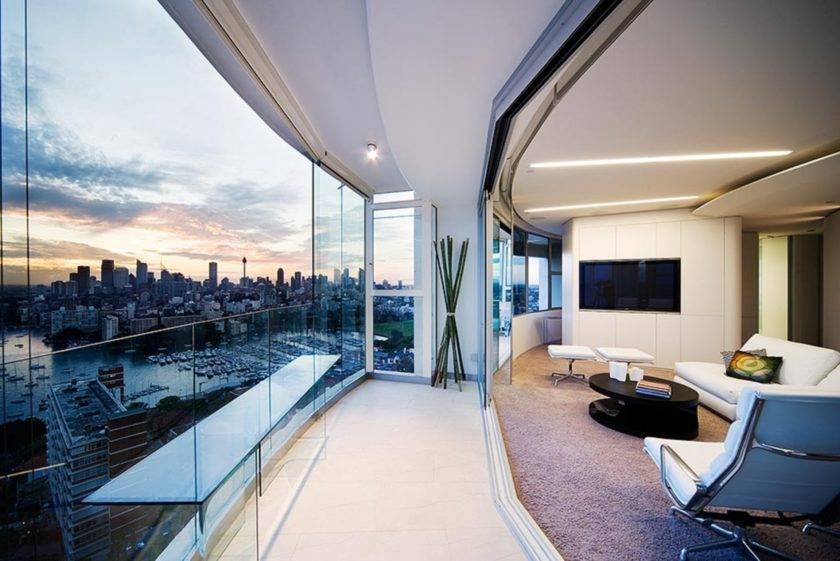 - Сплошной стеклопакет. Если вверху и внизу установлены профили-рельсы, на которых фиксируется и по которым осуществляет движение стеклянная балконная дверь, то владельцы квартиры могут получить самую необычную конструкцию. Подвижная стеклянная дверь может быть выполнена в стиле купе или складываться, как «гармошка». Но чаще всего хозяева подобных помещений предпочитают устанавливать радиусные двери на лоджию. Получается необыкновенный переход.
