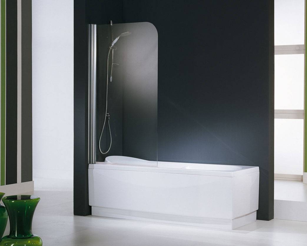 Это неподвижный экран, каркас которого не содержит створок. Конструкция больше напоминает не открывающуюся штору, а стационарную перегородку. В составе есть рама, которая жестко крепится к боковой стене комнаты и бортику ванны.