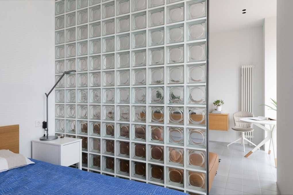 6.4 Зонирование комнаты. Перегородка из стеклоблоков не делит комнату полностью, а зонирует, отделяя спальню от гостиной.