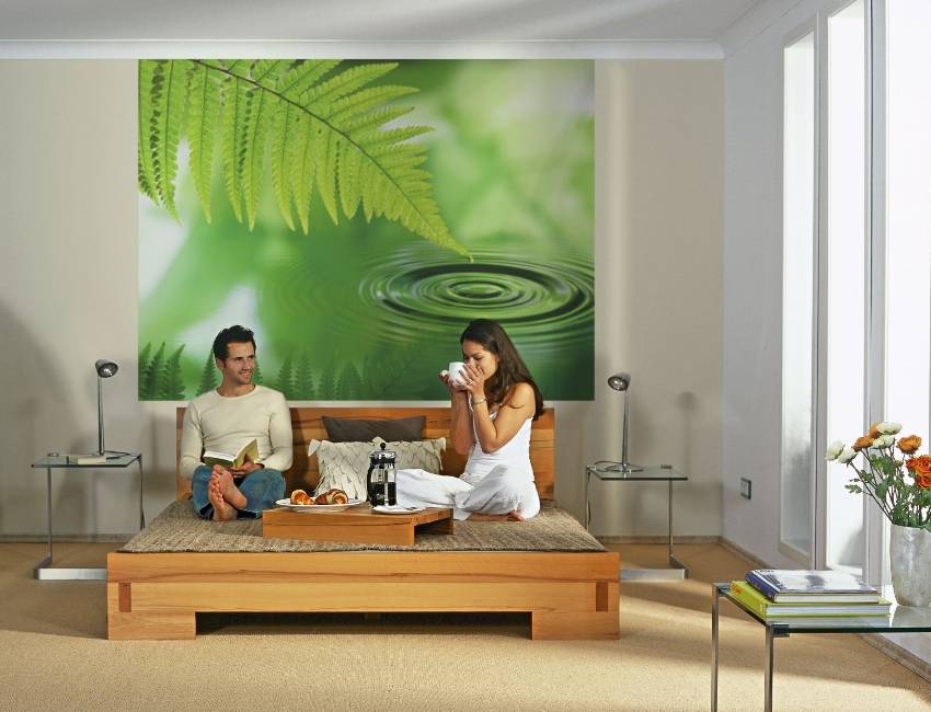 - 3д обои для обустройства спальни. Чаще всего подбирают спокойные тона и легкий мотив. Это напомнит прогулки на свежем воздухе или изображение звездного неба. Такие картины только поспособствуют продуктивному сну.