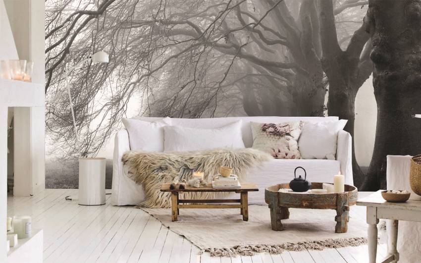 - Панорамные. Эта разновидность обоев наиболее популярна, т. к. создает эффект панорамы, занимает всю стену комнаты и даже в каких-то интерьерах две, также размещение по периметру комнаты. Длина составляет более двух метров.