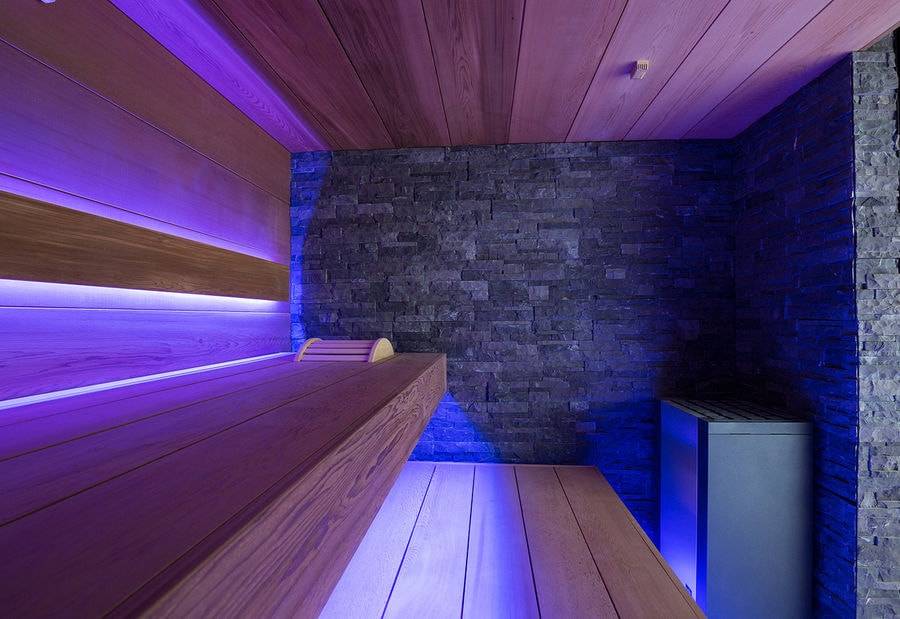 Светодиодные огни очень эффективны и могут использоваться так, чтобы ваша сауна имела как можно меньше теней, или их можно было разместить под скамейками, обеспечивая сияние света и создавая узоры на стене.