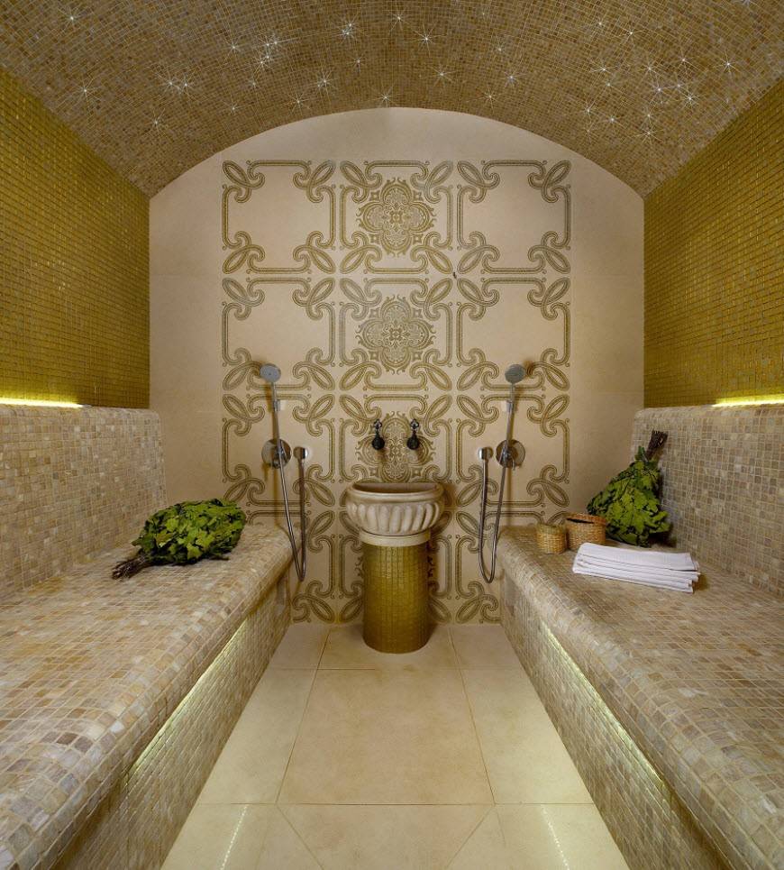 В душевой комнате, а также возле бассейна освещение в бане своими руками нужно сделать максимально ярким, чтобы избежать травм при падении. Поскольку высоких температур в этих помещениях не наблюдается, можно использовать абсолютно любые разновидности осветительных приборов, в частности, лампы дневного света, разнообразные точечные светильники для бани и ленты со светодиодами. Также приветствуется специальная подсветка для джакузи, если вы позаботились о его оборудовании.