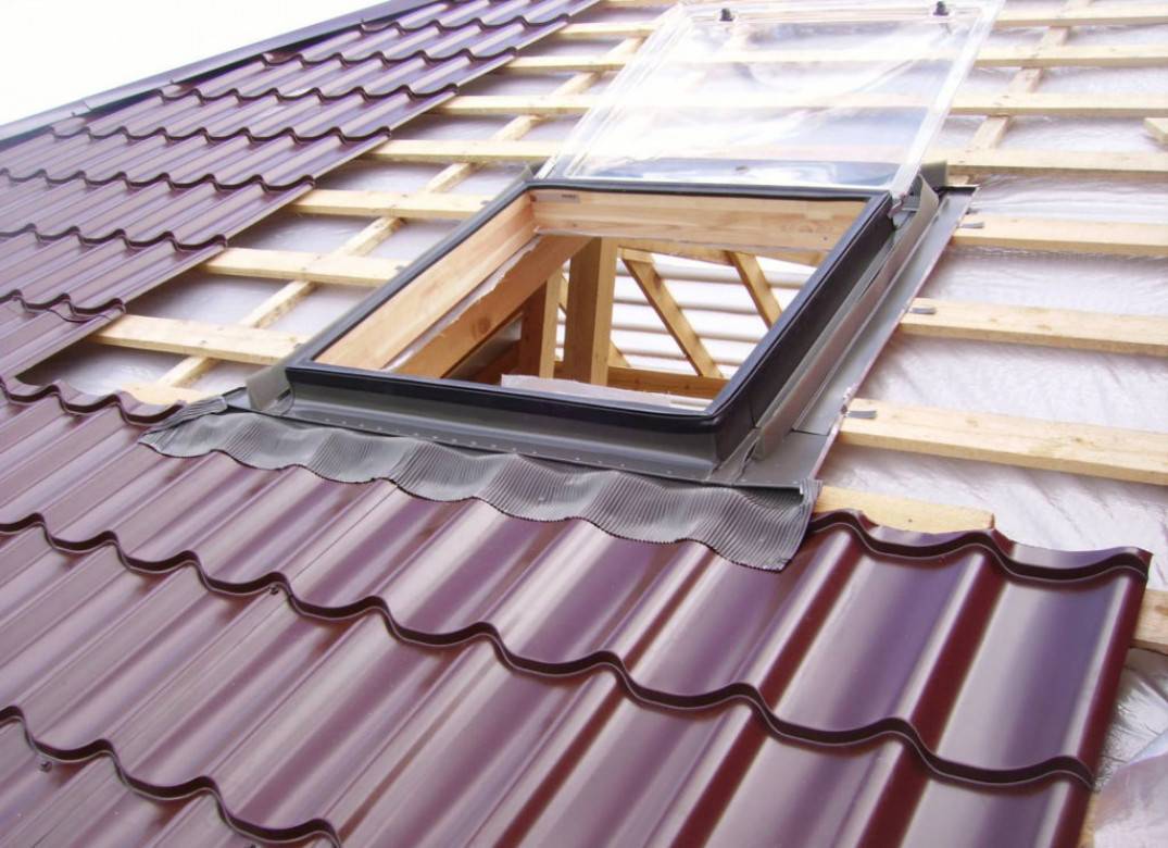 - далее переходим к кровельному покрытию. Если материал используется мягкий и без рельефов, то проблем не возникнет. Достаточно вырезать нужный кусок по размерам окна. Если для покрытия применялась металлочерепица или другой профильный кровельный материал, то нужно высчитать так, чтобы не срезать его посередине волны;