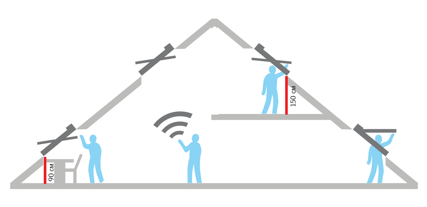 Также требуется правильно выбрать высоту, на которой будет проводиться монтаж окон. Расположение мансардных окон следует подбирать таким образом, чтобы нижняя часть рамы возвышалась над уровнем пола на 1-1,5 метра.