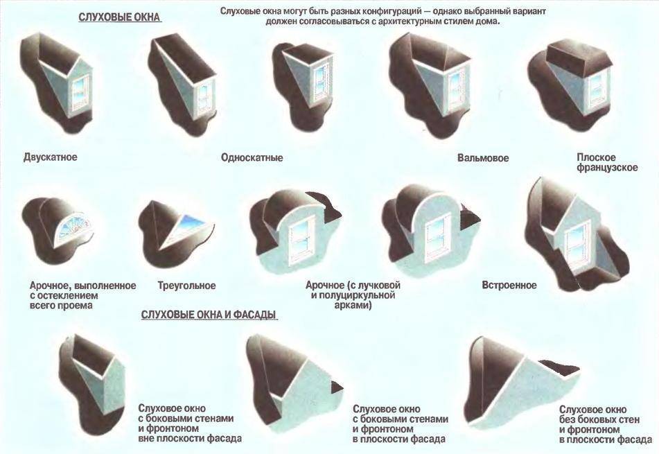 Слуховые окошки нередко еще именуют мансардными, потому что они расположены в деталях стропиловочной конструкции, формирующей крышу домостроения. Конструктивно эти оконные кровельные проемы типовые – проем/отверстие в кровельных плоскостях. Однако строители-кровельщики придумали разные типы этих элементов, от которых прямо зависит стропиловочная конструкция кровли домостроения: