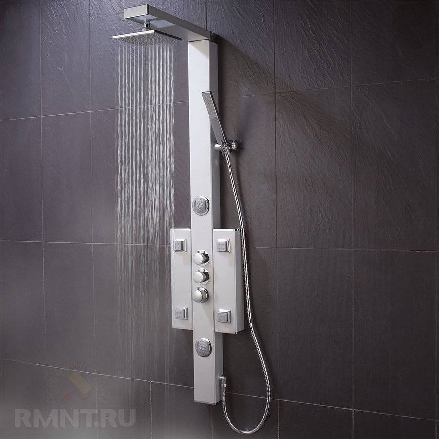 - Душевая панель. Этот тип оборудования предназначается для душевых кабин, хотя его можно использовать и для ванны. Данный тип устройства включает в себя и смеситель, и лейку для душа. Отдельные модели также оснащаются гидромассажными приспособлениями;