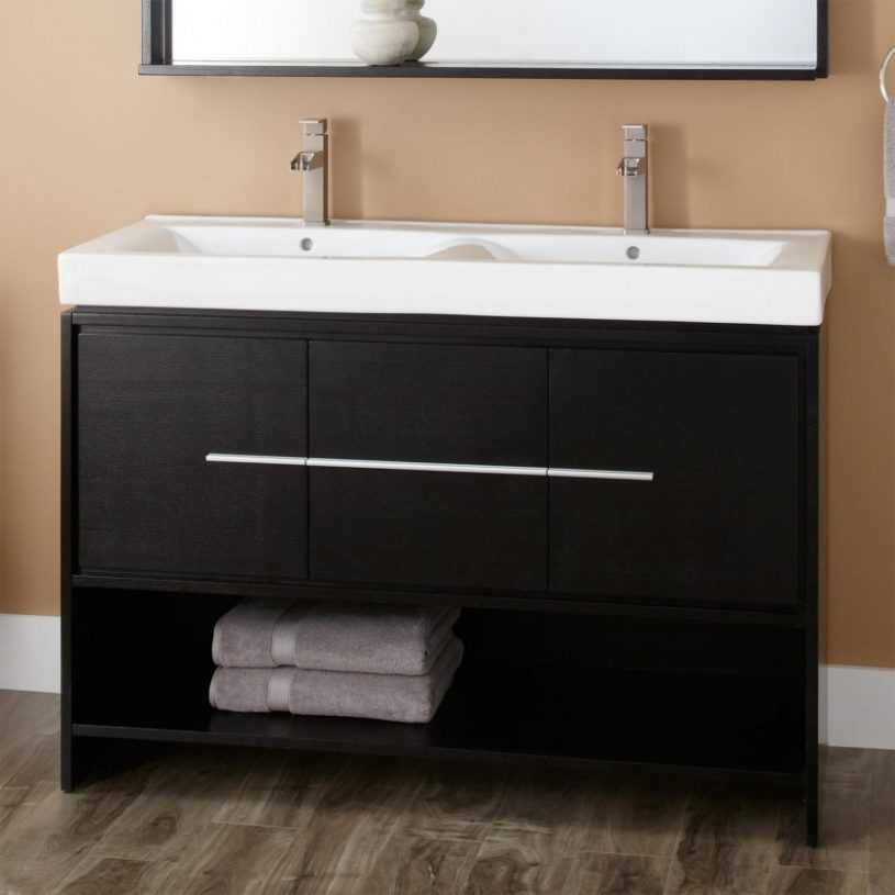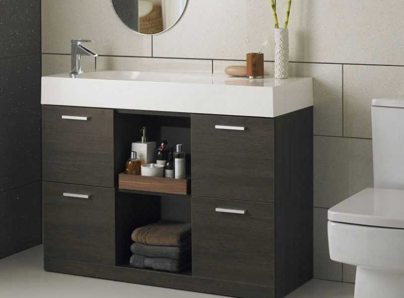 Она займет намного меньше места и облегчит процесс уборки. В санузлах средних размеров можно установить подставку под накладную раковину шириной в 80 см. В просторных помещениях нужно подбирать более крупные изделия, чтобы в общем интерьере они смотрелись гармонично. Поэтому в большой ванной будет уместной конструкция с удлиненной столешницей и дополнительными полками шириной от 100 до 120 см.