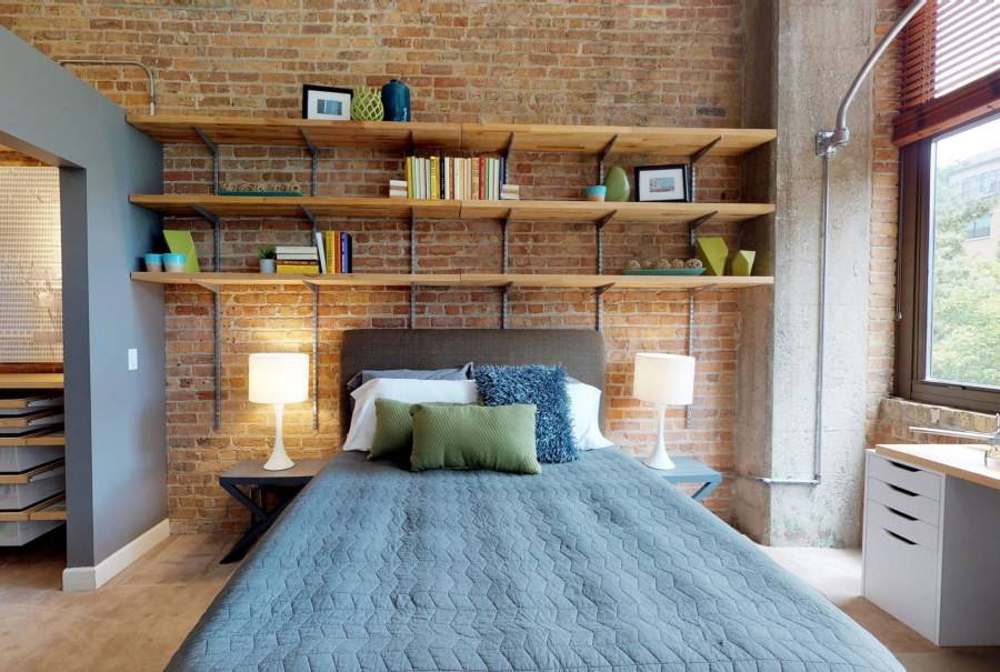 В урбанистический лофт идеально впишутся полки из дерева на металлическом каркасе