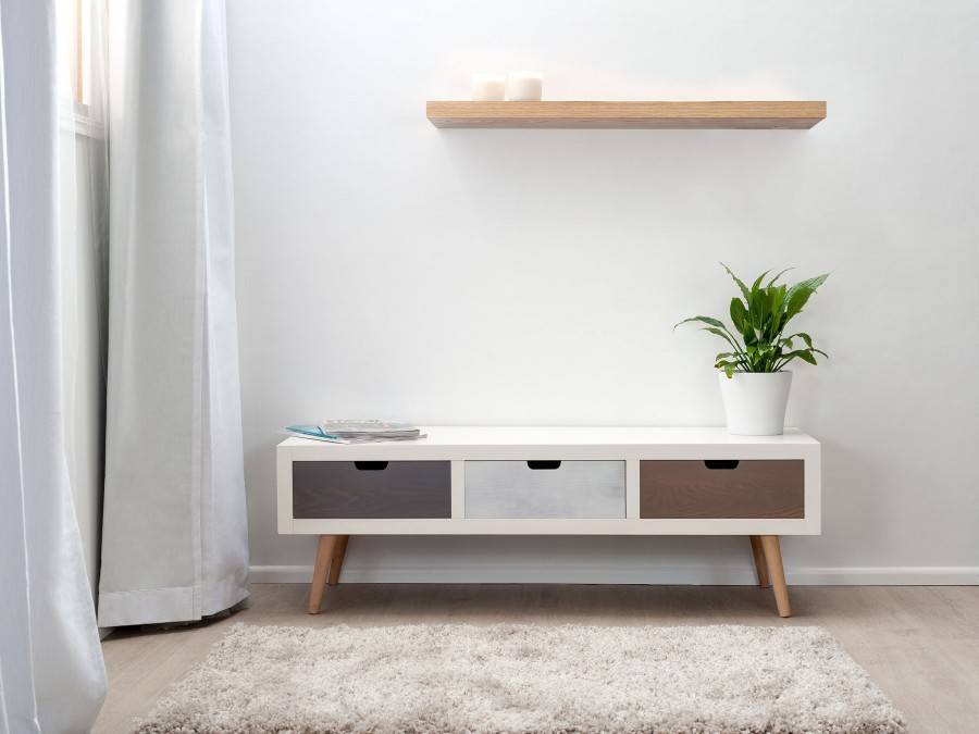 Если есть желание заполнить угол гостиной, но не хочется дырявить стены, можно оставить напольную модель в виде небольшого стеллажа