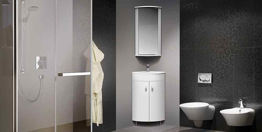 - «Угловой мойдодыр», как его называют из-за наличия тумбы со шкафчиками, наиболее функционален для небольших ванных комнат, в которых, тем не менее, есть пространство для некрупной тумбочки.