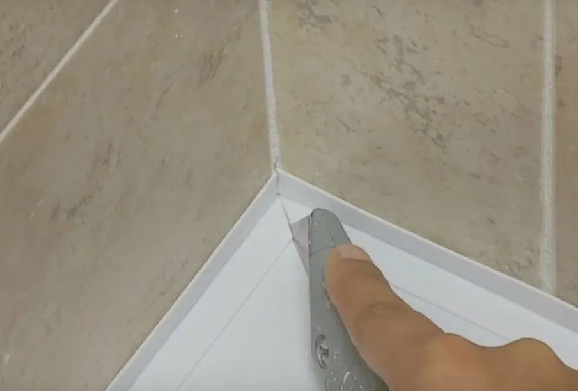 После полного высыхания клея плинтус надежно приклеился к керамической стене. Швы между уголком и кафелем нужно затереть. В зависимости от вида чаши для процедуры используют акриловый или силиконовый герметик.