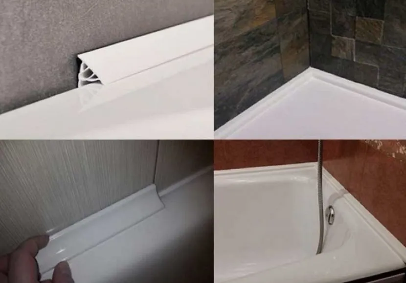 Чтобы нейтрализовать проблему, пластиковый уголок к легким конструкциям приклеивают только к кафелю. Верхний слой клея не даст воде протечь в щель между ванной и стеной. Нижние части плинтуса надо плотно зафиксировать к бортику, предупреждая просачивание сбоку. Малейшие движения компенсируют при помощи эластичного сооружения.