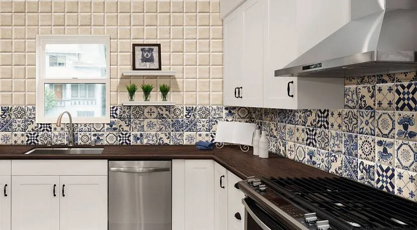 Квадратная керамика шириной 6 и 12 см подходит для дизайна интерьеров в стиле прованс или скандинавском. Светлая или пастельная гамма этой плитки подойдет для небольших помещений. В сочетании с мелкими фрагментами напольного покрытия такой кафель зрительно расширит кухню и сделает ее светлей.