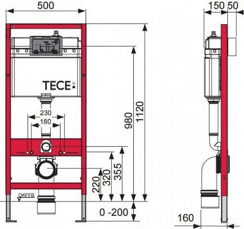 - Рамная. Боковые стойки крепят к полу. Есть возможность регулировать унитаз по высоте от пола. Размеры по глубине 150 – 350 мм, высота составляет до 1400 мм, ширина аналогичная блочному типу — 500 – 600 мм.
