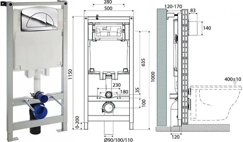 Ширина инсталляции для унитаза не зависит от ее типа: рамные и блочные стандартные системы имеют одинаковые параметры 500-600 ммИсточник samstroy.com