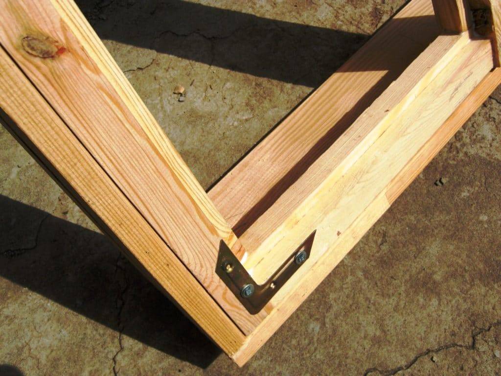Далее нужно взять наждачку и тщательно зашкурить все элементы. Коробку собирают на полу или другой ровной поверхности. Шипы и пазы смазывают столярным клеем, это повышает прочность монтажа. Необходимо следить за тем, чтобы все части окна были соединены под углом 90°. Для этого используется металлический уголок.