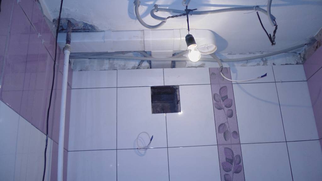 Рассчитывая диаметр вентилятора, учитывают, что надо оставить 5–10 мм по его окружности для надежной фиксации уплотнителем, герметиком, монтажной пеной. К прибору заранее подводится питание, подойдут любые от освещения, выключателя. Удобнее всего если кабели питания размещены предварительно в вентиляционном воздуховоде при укладке плитки. Используют также наружную проводку.