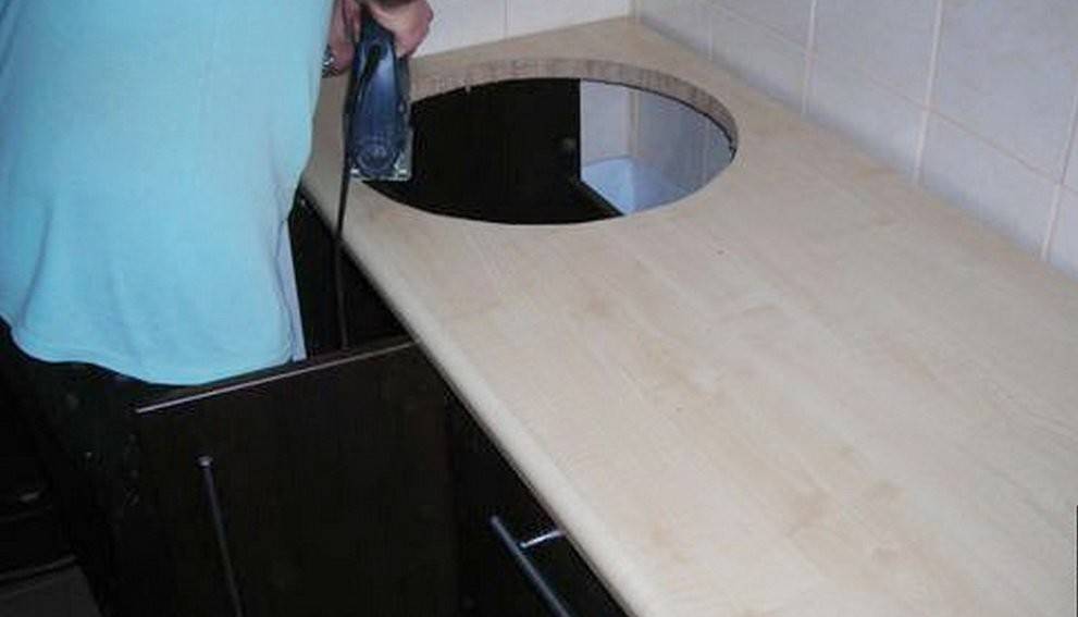 - Используя лобзик с мелкими зубцами следует отпилить ненужные края и подогнать столешницу по размерам;