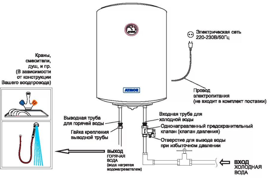 Правильно подключенный накопительный водонагреватель.