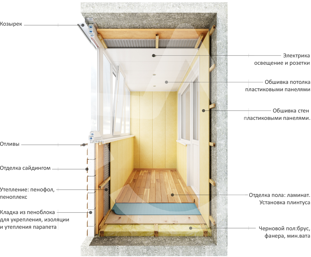 Прежде всего необходимо выполнить остекление лоджии. Оно бывает двух типов — холодное и теплое. Холодное, как следует из названия, предохраняет только от дождя и ветра, но вот на самом балконе теплее не станет. Лучше застеклить балкон металлопластиковыми окнами, тогда вы получите возможность провести туда отопление и использовать дополнительную площадь с пользой, как комнату для отдыха или хранения. Но после остекления, чтобы не позволить конструкции остыть, нужно утеплить сами плиты, потому что бетон обладает низкими теплоизоляционными свойствами.