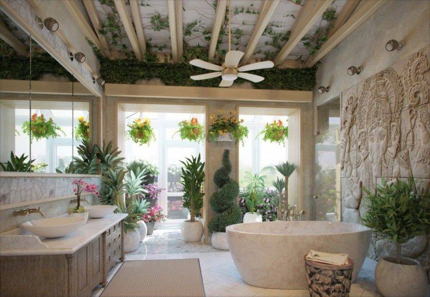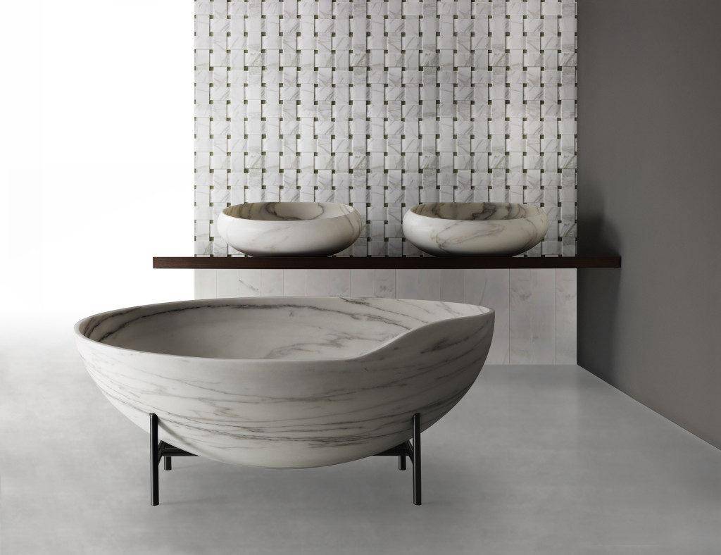 Как никогда выгодно овальная ванна из мрамора будет смотреться в центре ванной комнаты