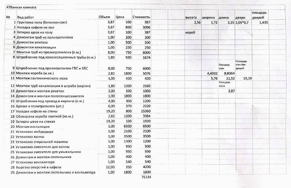 Я обращался за сметой к нескольким мастерам. Первого мне посоветовал знакомый. Я скинул ему размеры ванной и список своих «хотелок», а он расписал, сколько будет стоить работа. Тогда я еще не знал, что откажусь от подвесного унитаза, и попросил включить его в прайс. Получилось 75 134 Р — для меня это было дорого, и я стал искать другого мастера.