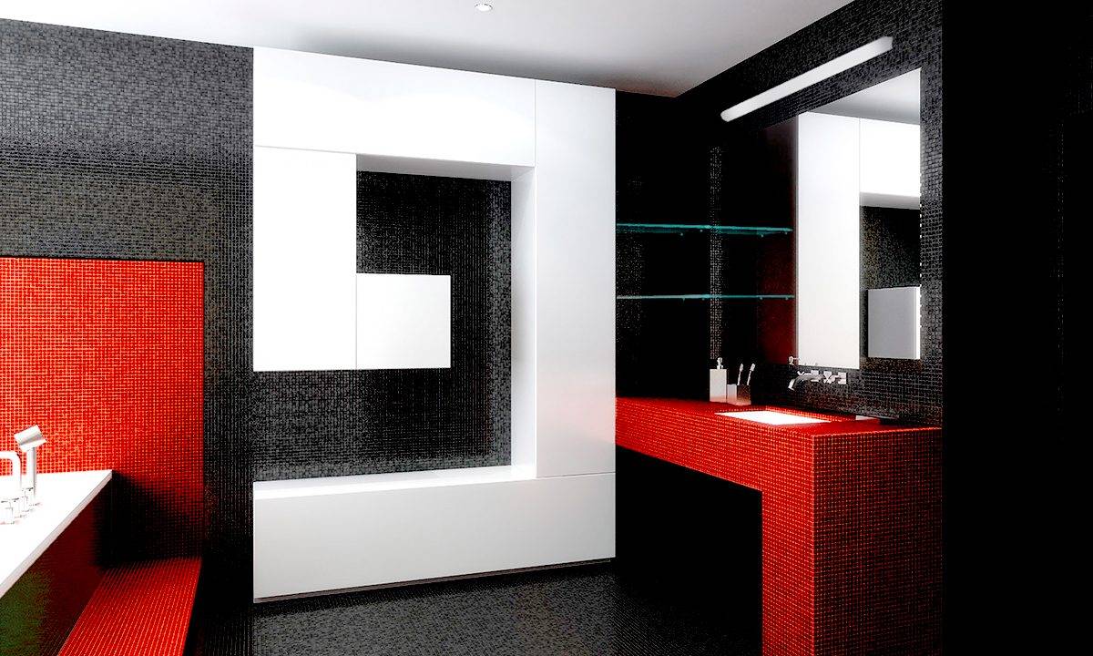Также можно встретить просто мозаичную однотонную кладку. Разбавить все это можно декоративными стеклянными панелями или из пластика. Иногда можно встретить, когда просто ошкуривают стены и красят водостойкой краской с глянцевым финишем, в соответствующих цветах. Как уже говорили ранее, на стенах необходимо исключить цветочные, кружевные узоры, которые абсолютно не соответствуют заданному стилю. Подходят геометрические орнаменты, четкие линии, изображения в абстракции.