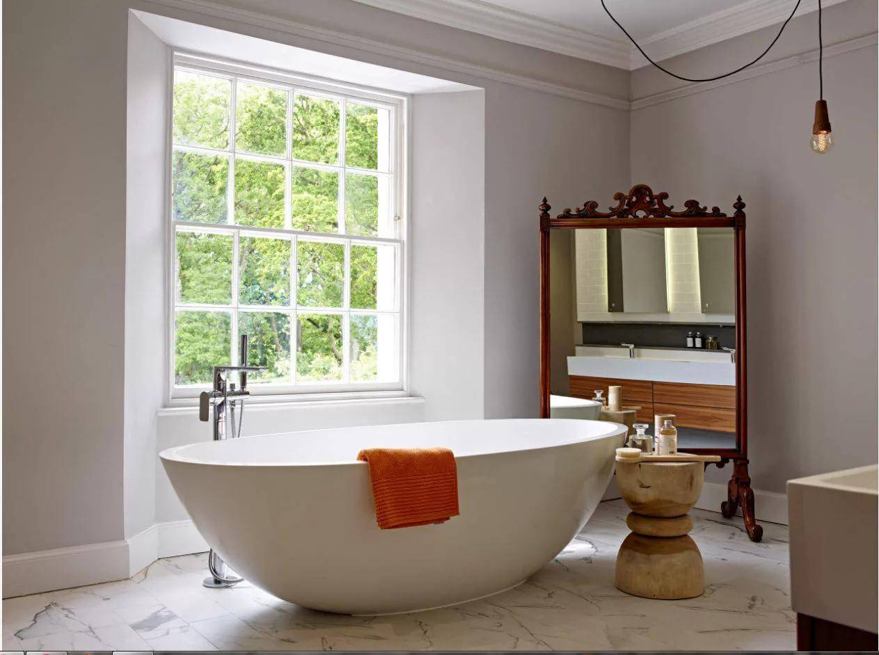 Дизайн ванной комнаты в классическом стиле приветствует большие окна, использование камня в отделки, резных предметов. Наличие мягкого пуфа и коврика у ванной добавит уюта.
