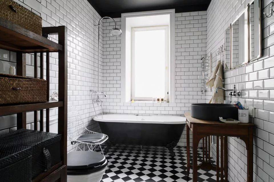 — Центральным местом в интерьере выступает сама ванная, которая может быть как белого, так и черного цвета.