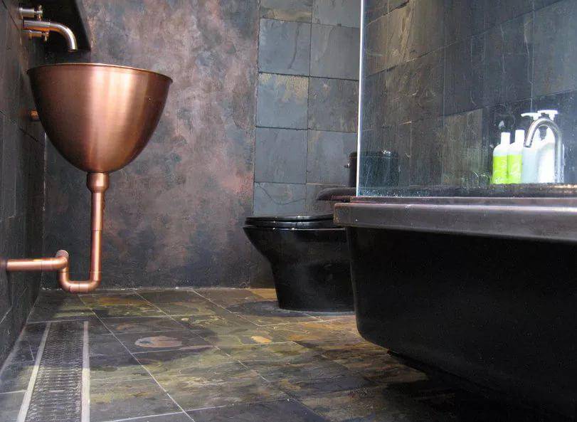 Обилие черного подойдет только для просторных и светлых ванных комнат. Иначе она получится слишком мрачной и визуально маленькой. Как и в случае со стерильным белым, современный стиль редко использует глухую черноту. Чаще – глубокие пыльные и пепельные оттенки.