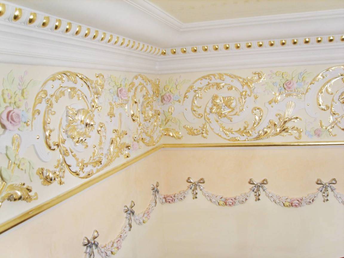 - Дорогие отделочные материалы: облицовочный камень, специальные обои с имитацией шелка, натуральное дерево, лепнина, позолота и декор из металлов под медь и бронзу.