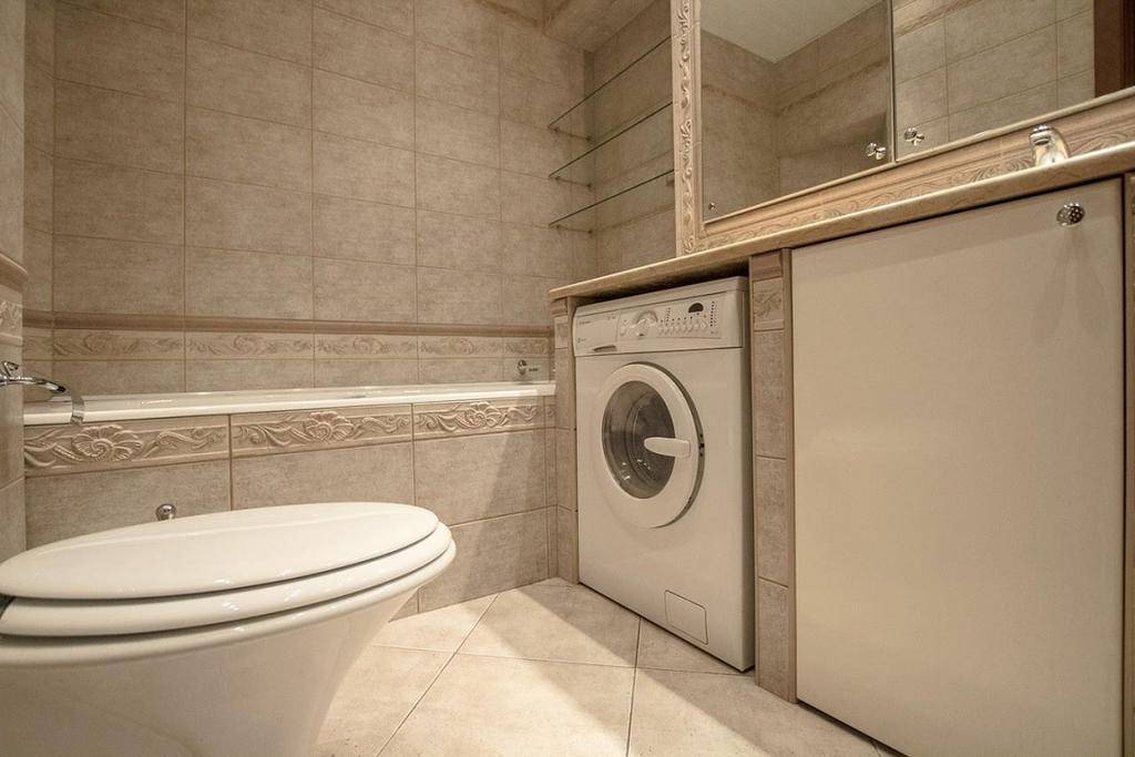 Фото 4. В интерьере ванной комнаты постирочная выделена в отдельную зону. Чтобы сэкономить место, стиральная и сушильная машины поставлены друг на друга.