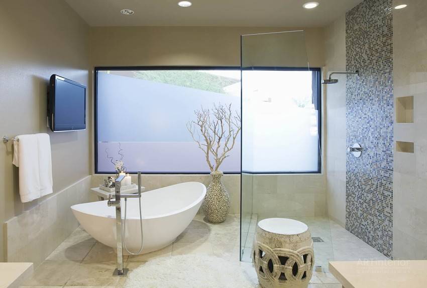 Овальная чаша в виде большого камня выглядит одновременно просто и экстравагантно. Угловые ванны или ванны, установленные по диагонали – воплощение той самой модерновой асимметрии. Джакузи с подсветкой, гидромассажем и другими дополнительными опциями – самое современное и стильное решение.