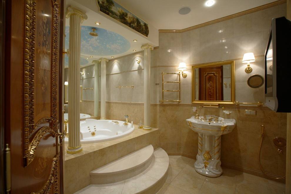Один из «масштабных» вариантов – оформление ванной комнаты в классическом стиле. Следует уточнить сразу: реализовать такую идею можно только на большой площади, поскольку классика подразумевает изысканность, торжественность и несомненную роскошь. Характерными особенностями обустройства комнаты в этом случае будут: