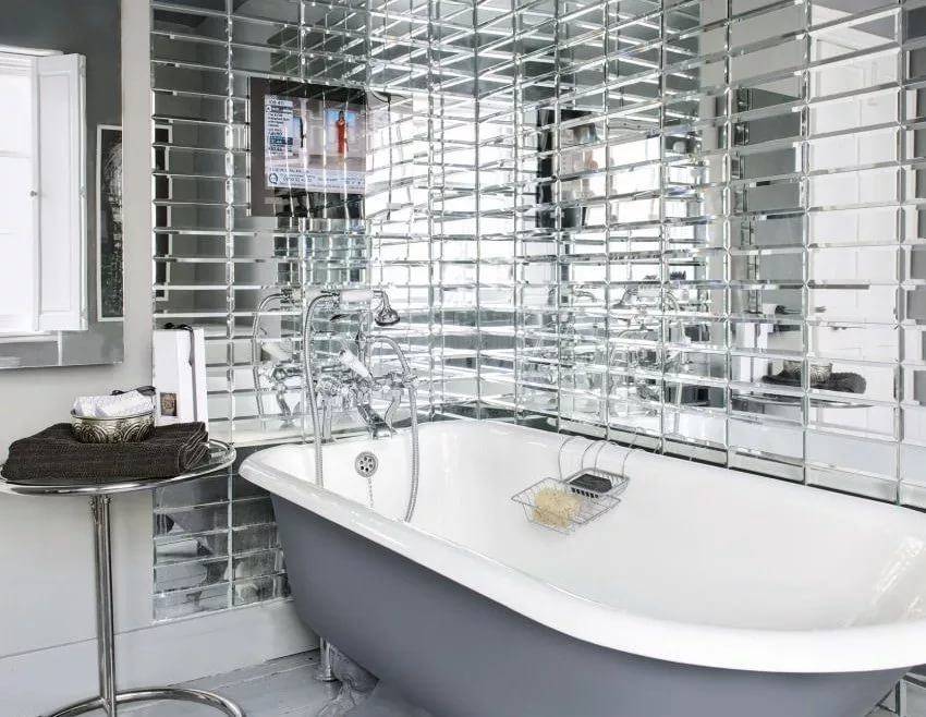 Красивый интерьер ванной создаст зеркало, играющее роль облицовки стены. Эффектно смотрятся небольшие зеркала, наклеенные на стену в виде плитки.