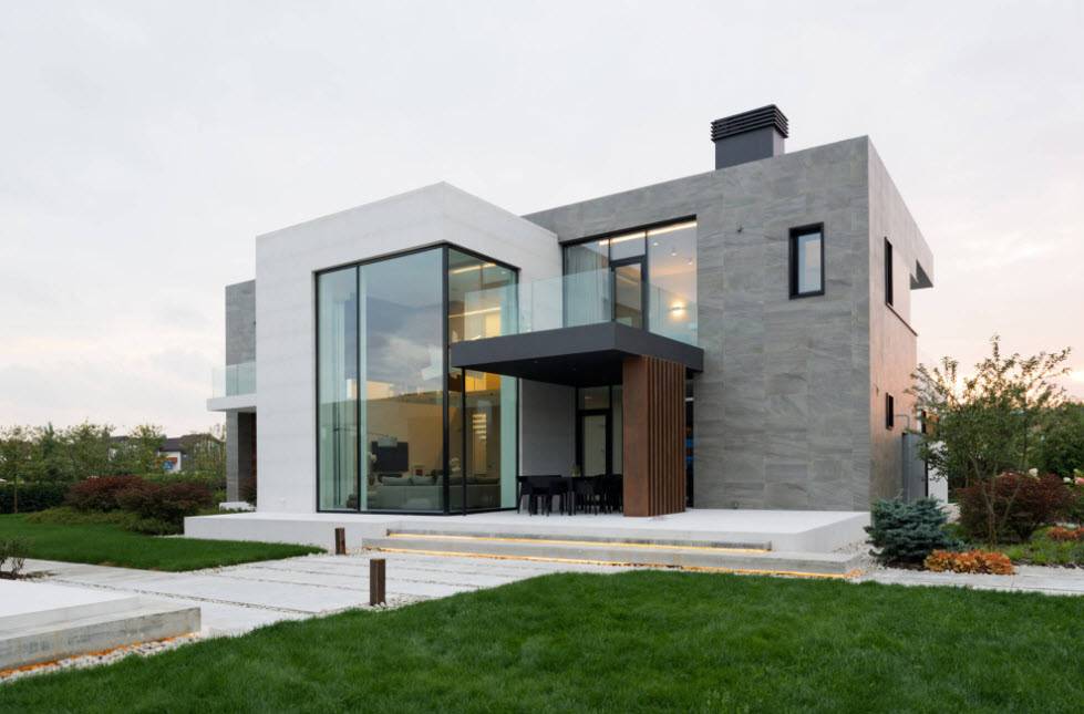 Модерн предполагает использование причудливых форм, которые отделаны виниловым, цементным сайдингом, глазурованной плиткой, стеклом. Хай-тек являет простоту, без вычурности. Применяют материалы с гладкими, блестящими поверхностями, стекло, металлический сайдинг, кассетные фасады.