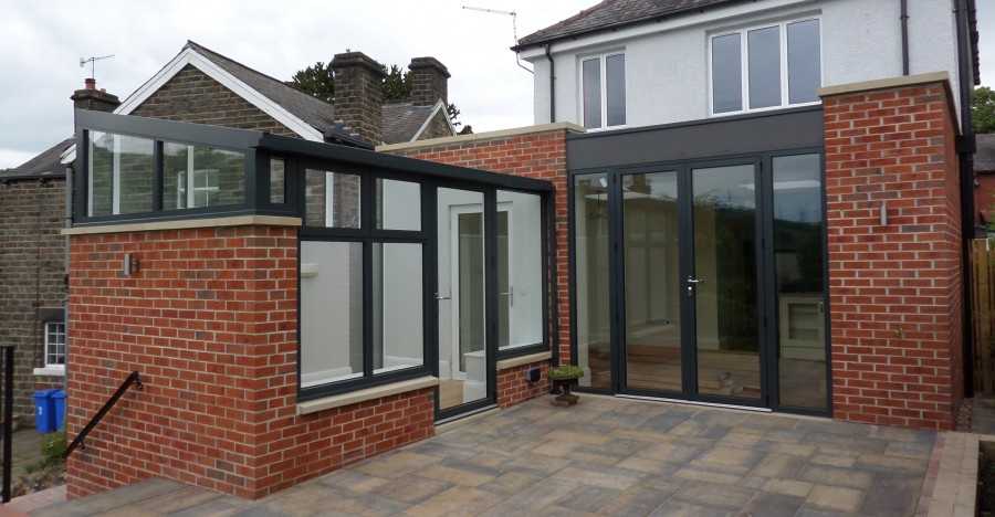 Более строгий вид фасада – стальной серый и красный цвет в сочетании с красной крышей