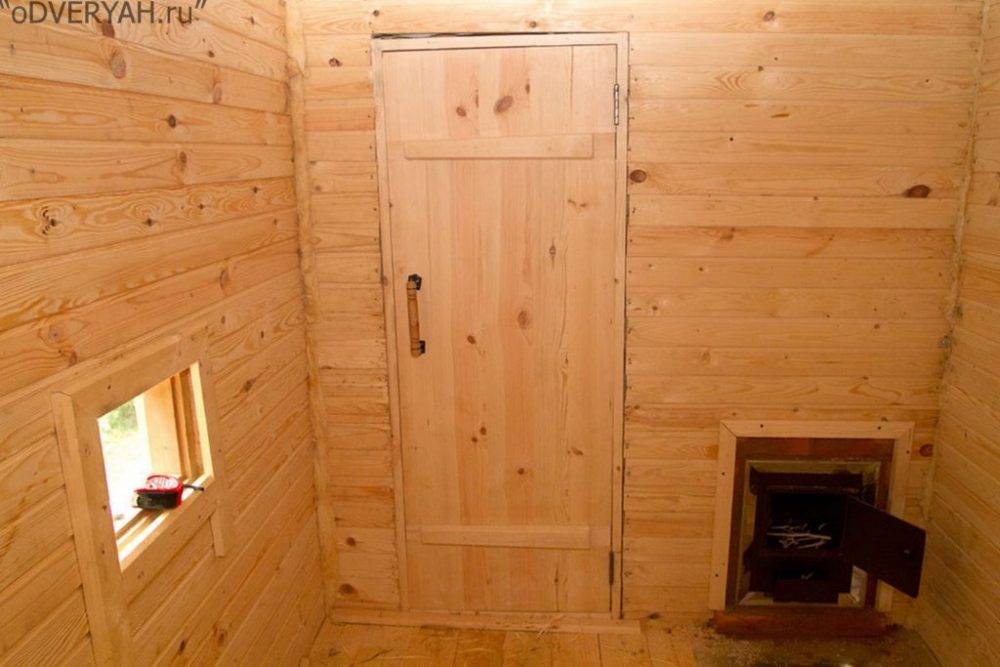 В бане нет необходимости ставить двустворчатую дверь, достаточно неширокой одностворчатой размерами примерно 1,8х0,8 м.