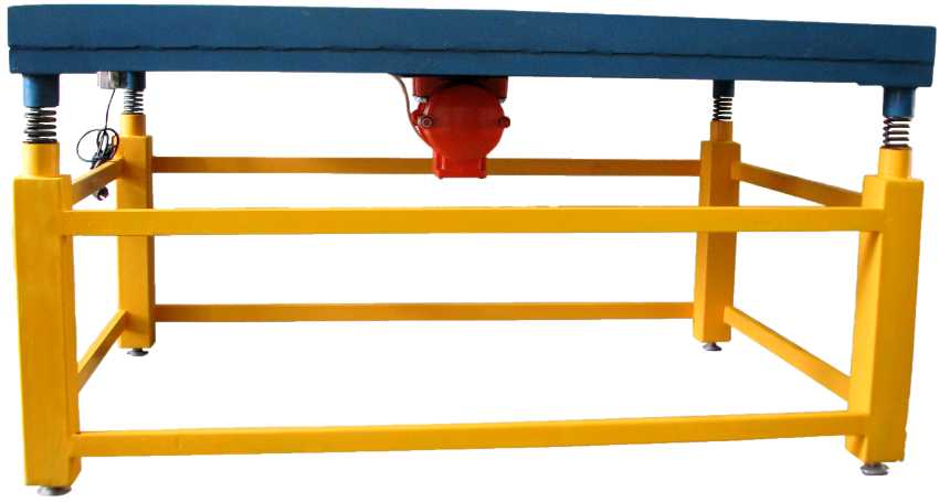 Основной элемент вибростола — двигатель с эксцентриком, которые в паре образуют вибрирующий узел. Вибромеханизм приводит в движение подвижную плиту, на которой в процессе производства будет располагаться форма с раствором. Под воздействием вибрации плиты раствор уплотняется до определенного предела, после чего на плиту устанавливают новые формы.
