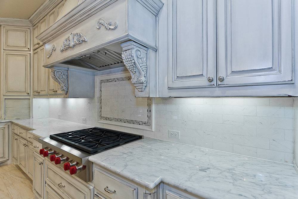 Белый натуральный мрамор дополнит богатый вид кухни с изящной мебелью.