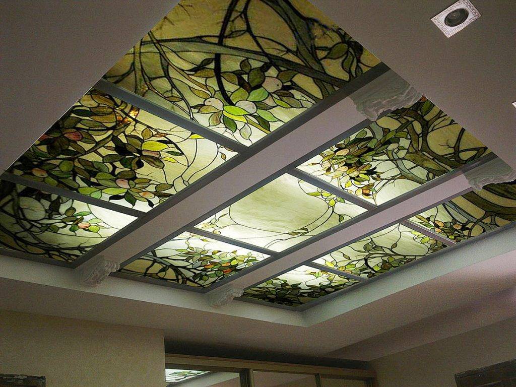Вставки в потолках. Потолочные витражи — наиболее сложный в исполнении вариант плоской либо изогнутой формы. В зависимости от геометрии помещения, устанавливается витраж в форме купола, круга, квадрата, плафона. Монтаж готового витража выполняется в гипсокартонную нишу или в цельную гипсокартонную конструкцию (если предусмотрена подсветка). Витражная вставка Тиффани красиво выглядят в холле, ванной, спальне.