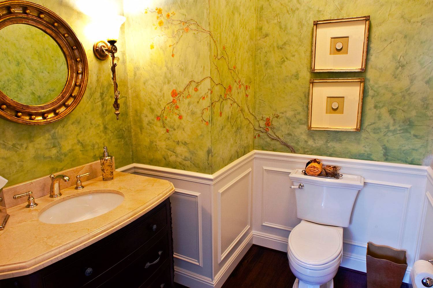 В числе первых – «венецианка». Ее нанесение позволяет получать идеально ровную поверхность, имеющую глянцевый или перламутровый перелив. В составе присутствует восковой компонент, который отталкивает влагу и не позволяет воде впитываться в структуру отделки. Такая декоративная штукатурка в санузле и в ванной комнате смотрится великолепно. Она идеально подходит для создания классических интерьеров, для украшения комнат, в которых присутствуют арочные своды, колонны, пилястры. Опытный мастер способен создавать при помощи такой штукатурки красивые фрески. Его работа, да и сам состав, стоит дорого, но результат того стоит. Выбор такого состава оправдан, если нужно поддержать высокий статус хозяев жилья.