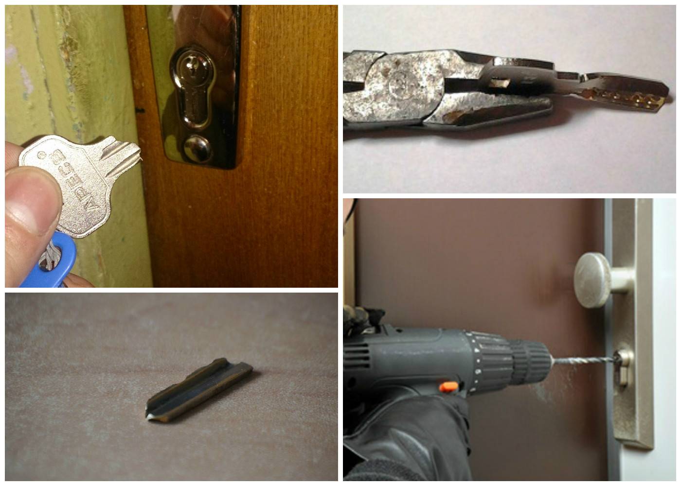 Серьезная, но поправимая проблема возникает, когда при попытке открытия входной двери, вставленный в замок ключ просто ломается. В этом случае нужно при ярком освещении внимательно осмотреть скважину замка и если обломок ключа, оставшийся в ней, выглядывает наружу, открыть дверь квартиры можно с помощью плоскогубцев взятых на время у соседей. Нужно зацепить инструментом край сломанного в замке ключа и провернуть его в сторону открытия двери. После срабатывания замка и выхода его ригелей из дверной коробки обломок ключа нужно извлечь.